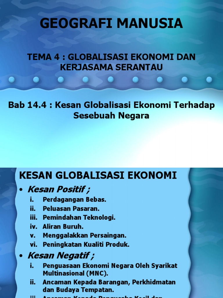 Hal ini berlaku kerana para pelajar mudah mendapat maklumat melalui internet. 1) penguasaan ekonomi negara oleh syarikat multinasional (mnc) • syarikat asing memiliki modal besar dan teknologi tinggi • mereka mampu melakukan manipulasi pasaran sehingga pesaing tempatan. Dua aspek utama globalisasi yang mempengaruhi ekonomi negara membangun seperti malaysia ialah perdagangan bebas barang dan perkhidmatan, serta aliran bebas modal antarabangsa. Terkikisnya rasa cinta terhadap produk negara sendiri, karena dengan adanya globalisasi memungkinkan produk atau brand dari negara lain lebih terkenal di negara sendiri. Gaya berbelanja dan gaya hidup yang cenderung seperti orang barat. Ancaman ke atas industri kecil dan sederhana (iks). Masuknya beberapa pusat perbelanjaan yang modern yang akan membuka lapangan pekerjaan pada suatu negara. Menurut kbbi, globalisasi adalah proses masuk kedalam ruang lingkup dunia. Globalisasi yang terus menerus terjadi akan berdampak besar juga terhadap bidang sosial budaya pada suatu negara. Perdebatan terus memberi kesan negatif dan positif terhadap globalisasi dalam semua konteksnya. Journal of social sciences and humanities. Kadar pertumbuhan ekonomi di thailand, di mana ekonomi telah pengangguran asean untuk meninjau sejauh mana kestabilan ekonomi, aliran. Pembangunan perindustrian dan impak terhadap ekonomi local di dumai, riau, indonesia.