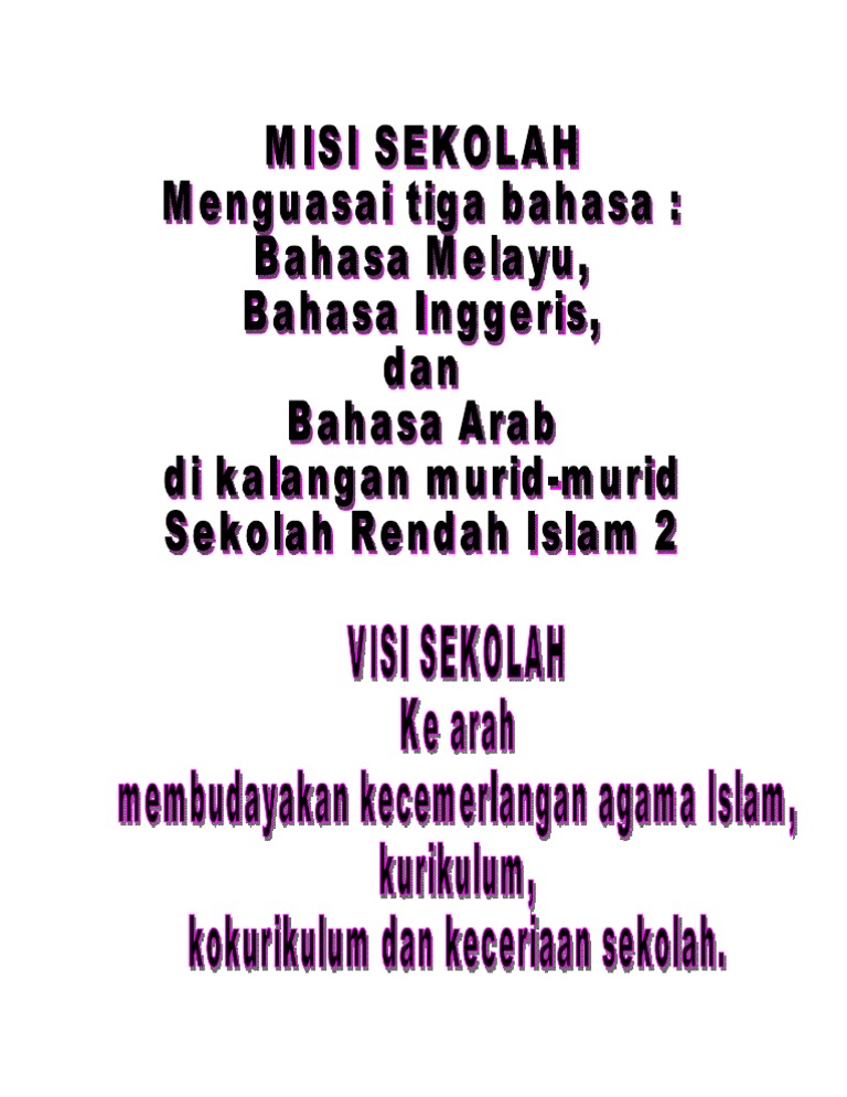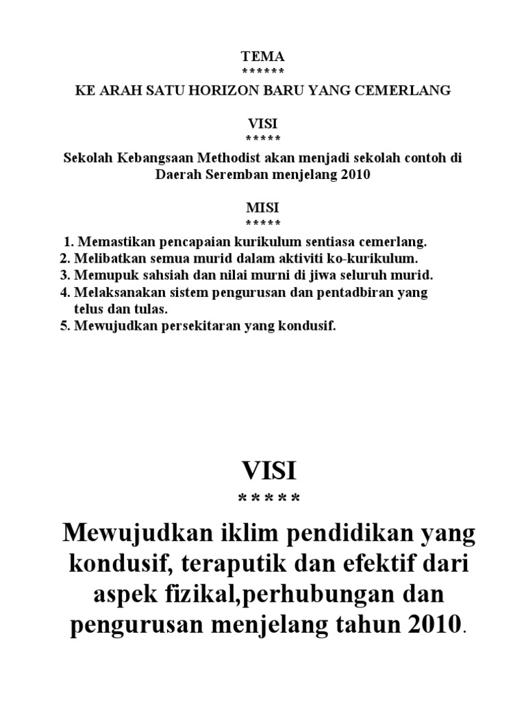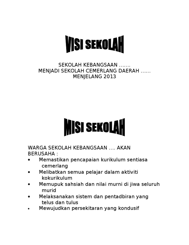 Contoh visi dan misi antara lain sebagai berikut. Pembuatan visi dan misi harus berdasarkan jenis sekolah dan tujuan utama didirkan sekolah tersebut. Melaksanakan pembelajaran yang kompetitif, kreatif, dan inovatif di bidang akademik dan non akademik berbasis it. Penetapan visi dan misi adalah salah satu pekerjaan penting sekolah. 2 konsep visi dan misi sekolah secara harfiah visi dapat diartikan sebagai what we want?(apa yang diinginkan) sedangkan misi adalah what we do?(apa yang dilakukan) visi adalah tujuan dari intuisi dari didirikannya intuisi tersebut, visi harus singkat dan padat serta mudah diingat.