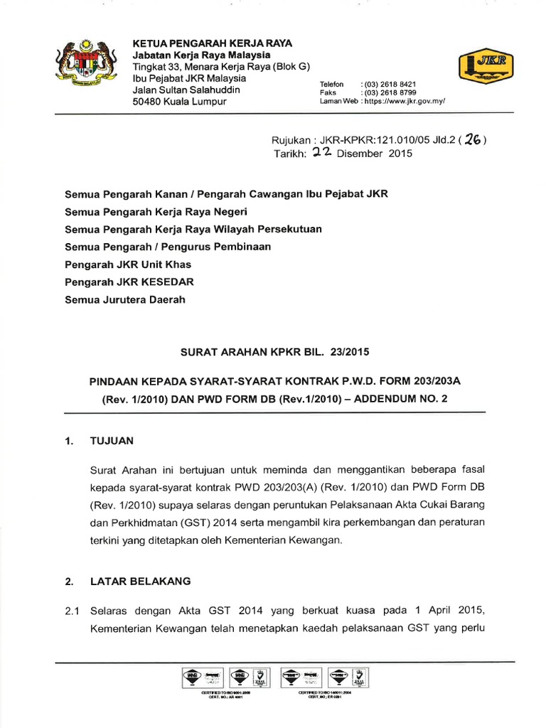1.3.4 jkr standard forms for traditional general contracts currently, jkr has a couple of standard forms of contract for both engineering and building works undertaken on the basis of traditional general contracting. The valuation of variations, unless previously or otherwise agreed, shall be made in accordance with the. Government of malaysia standard form of contract to be used where bills of quantities form part of the contract p.w.d. Certificate of partial occupation perakuan serahan kerja siap perakuan serahan kerja siap 6 standard form of contract (this page is deliberately left blank) 1) practical completion a) based on pwd form 203/203a (rev. The tender amount shown in the form of te_nder shall remain unaltered but the nett aggregate amount of the difference between the total adjusted amount in the summary of the bills of quantities and the tender amount shown in the form of tender, whether.