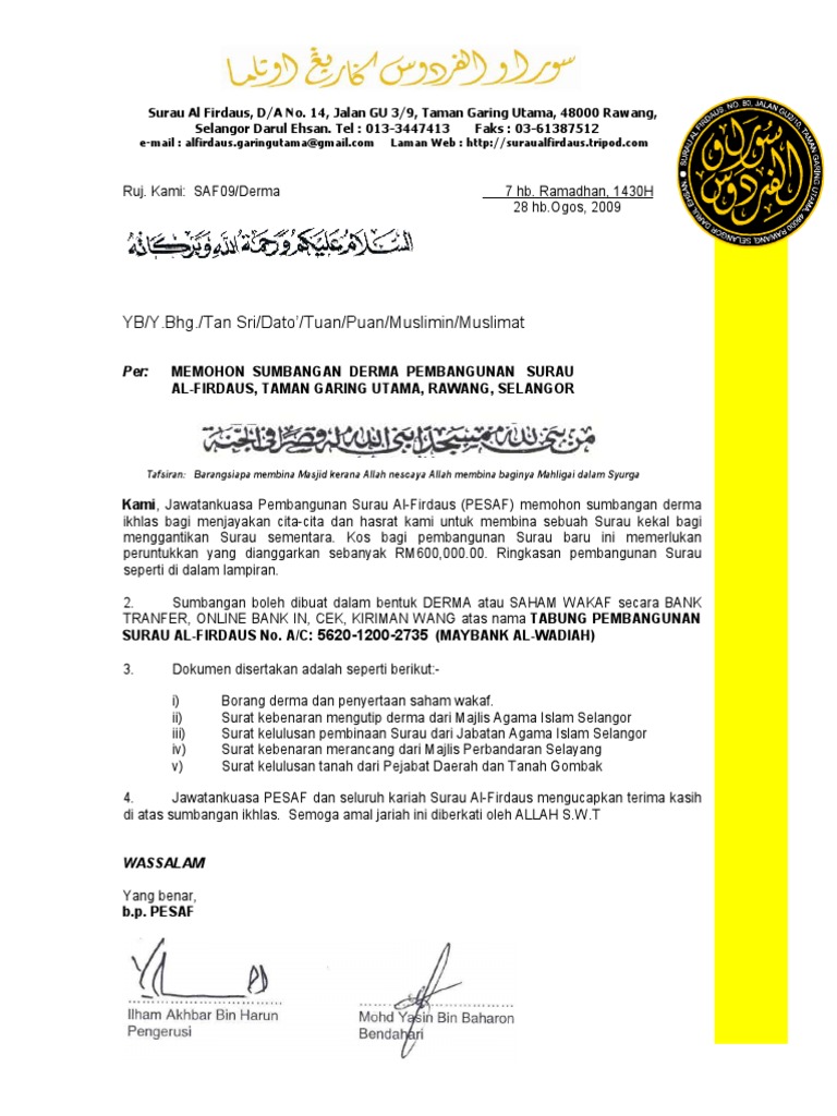 SURAU AL-MUHAJIRIN TAMAN BUKIT JAYA.: BUKTI DOKUMENT SOKONGAN. from 1.bp.blogspot.com Maka ia akan akan mengajukan permohonan kepada pihak tertentu untuk memberikan bantuan, dana, kerjasama atau mungkin rekomendasi. Surat pengalaman kerja merupakan surat pernyataan berakhirnya hubungan kerja karyawan dengan perusahaan yang mencantumkan pengalaman karyawan tersebut selama bekerja. Perlu anda tahu bahwa surat pengunduran diri termasuk surat resmi, yang artinya adalah anda harus memperhatikan mengenai gaya bahaya yang akan di bawah ini akan kami berikan contoh surat pengunduran diri yang bisa anda jadikan acuan atau contoh untuk nantinya anda membuat surat. Contoh surat permohonan kebenaran memungut derm. Butiran lain yang kena ada termasuklah Surat kebenaran mengutip derma dari majlis agama islam selangor surat kelulusan pembinaan surau dari jabatan agama islam selangor surat kebenaran merancang dari majlis perbandaran selayang surat kelulusan tanah dari pejabat daerah dan tanah gombak. Di atas adalah contoh surat manakala di bawah adalah muaturun bagi contoh surat ini. Guna menjali komunikasi antar instansi, perusahaan, organisasi atau kelompok masyarakat, hingga saat ini surat masih menjadi pilihan pertama.